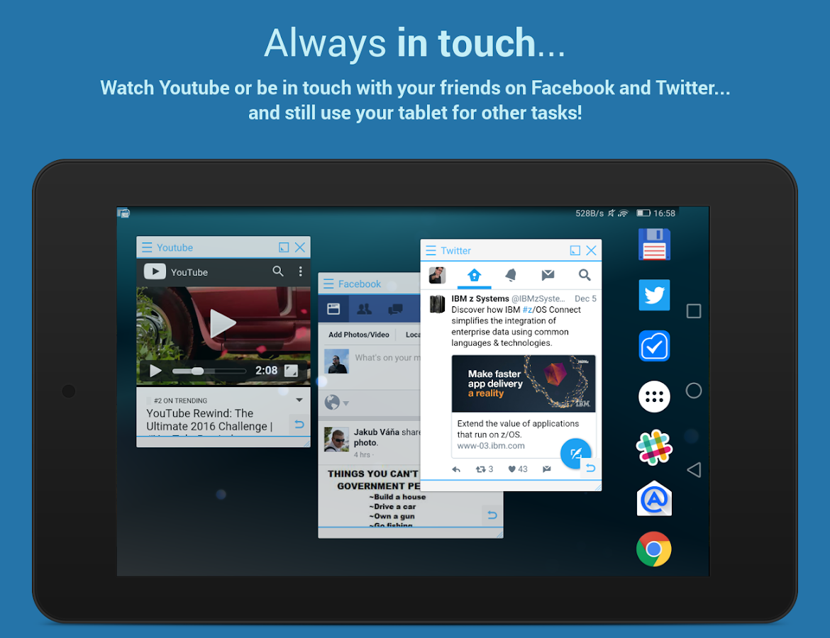 Floating Apps Free adalah app percuma sebagai alternatif bagi fungsi multi window yang tiada by default pada smartphone Android biasa. Pada phone Android spesifikasi tinggi memang ada tapi ciri itu di bawah manufacturer phone, bukan di bawah OS Android. Contohnya, apabila kita buka youtube, lepas tekan Home dan buka app lain video youtube akan berhenti. Dengan app ini..kita dapat buka youtube, browser, dan beberapa app lain serentak secara multitasking (video youtube takkan berhenti). Contoh lain, jika anda mahu guna whatsapp sambil melihat youtube, anda boleh buka youtube sebagai floating app dan guna whatsapp seperti biasa. Sebenarnya ada fungsi multi window pada phone Android biasa, tapi ianya adalah hidden feature dan masih dalam beta mode. So, kalau nak enable kan terpaksa root phone, jadi superuser, On kan developer & debugging mode, & beberapa step lagi yang agak teknikal. Cuma masalahnya warranty phone akan void kalau root. Phone baru better jangan buat. Lagipun, better tunggu update Android 7.0 Nougat nanti, di mana feature multi window tu akan jadi default feature.